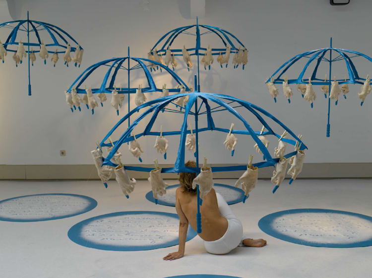 IT'S RAINING artist interaction mixed media installation: umbrella skeletons, car paint, blue paper covered with coarse salt ,clothes pins and latex gloves variable sizes