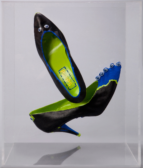 15x12½x 8¼, mixed media: dolls eyes+ acrylic paint on high heel shoes.